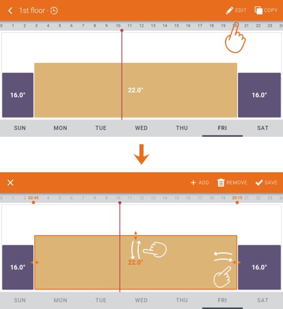 Select a day you want to edit and then tap on the Edit field. You can add or remove time slots in the heating schedule. Change heating period duration and temperature by dragging.
